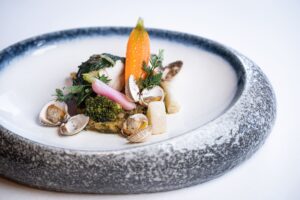 Lotte cuite au feu de bois, potimarron et choux de Bruxelles, coulis butternut et huile de crevettes grillées