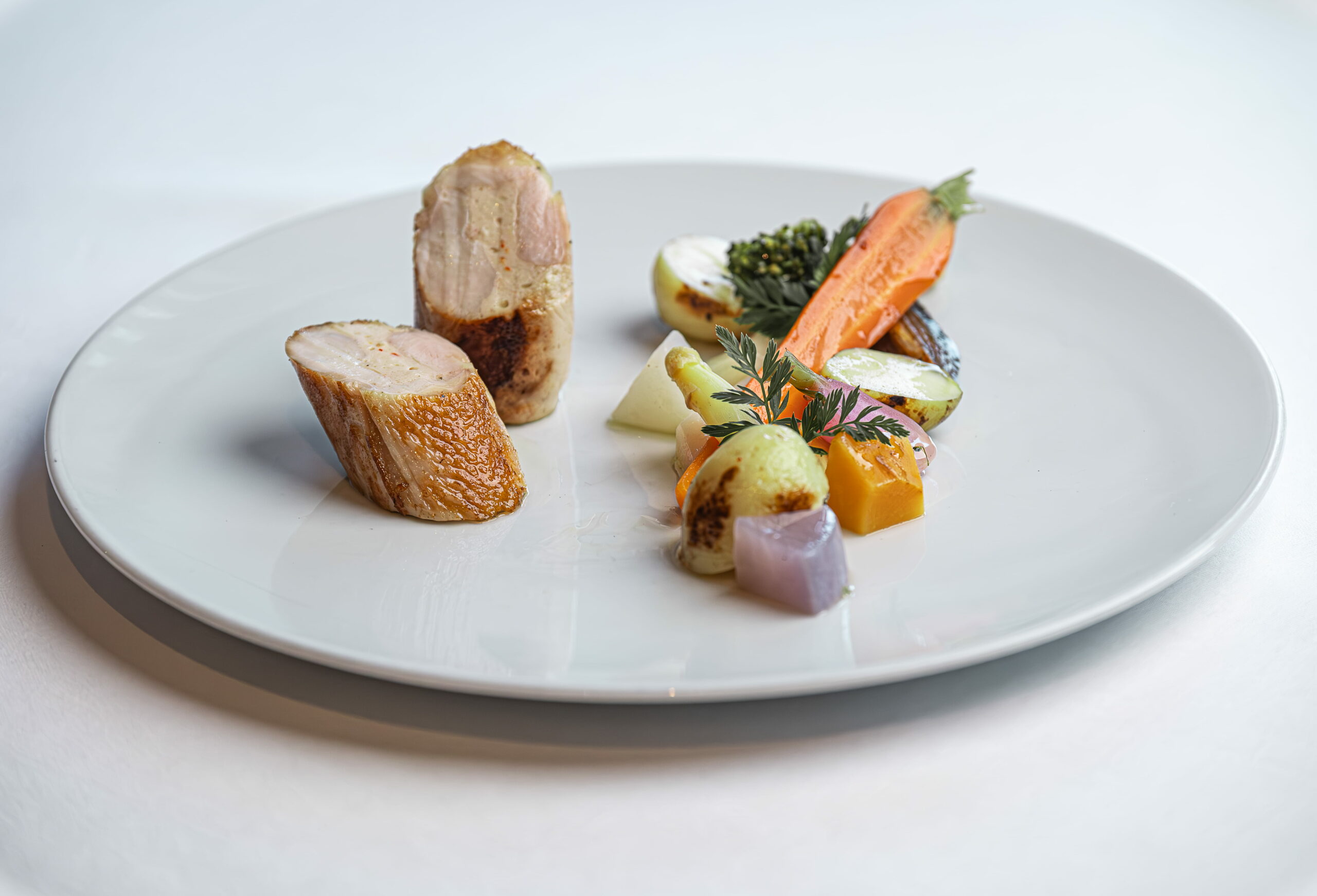 Poisson noble du moment aux asperges, sabayon à la pistache et éclats de pistaches